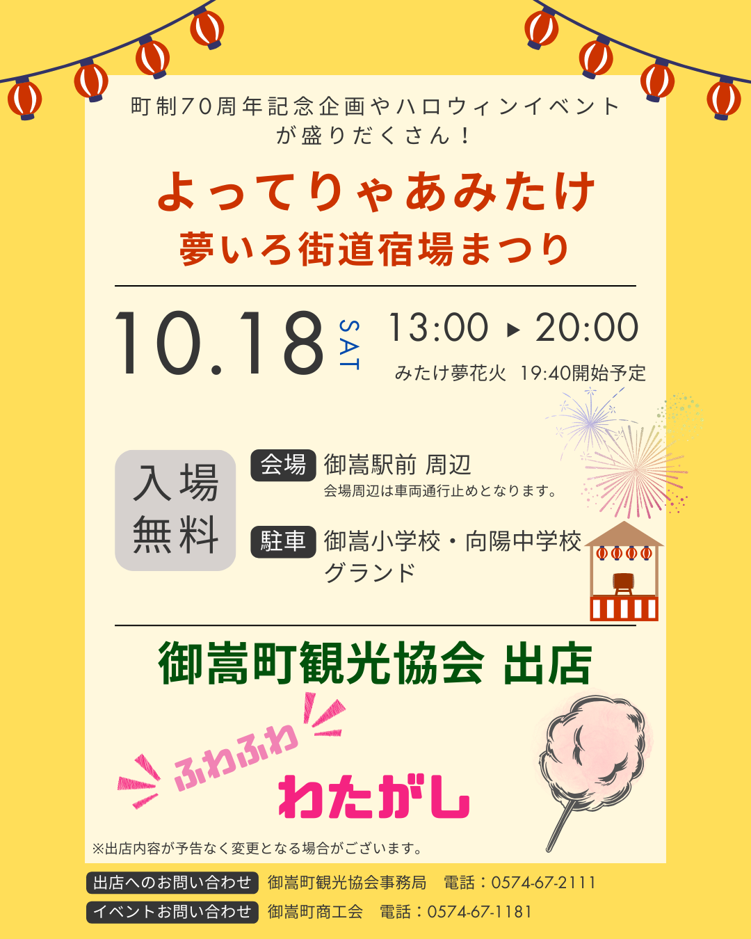 御嵩町観光協会も出店します。 【出店内容】綿菓子(販売予定) ▶イベント詳細名称|第28回よってり…