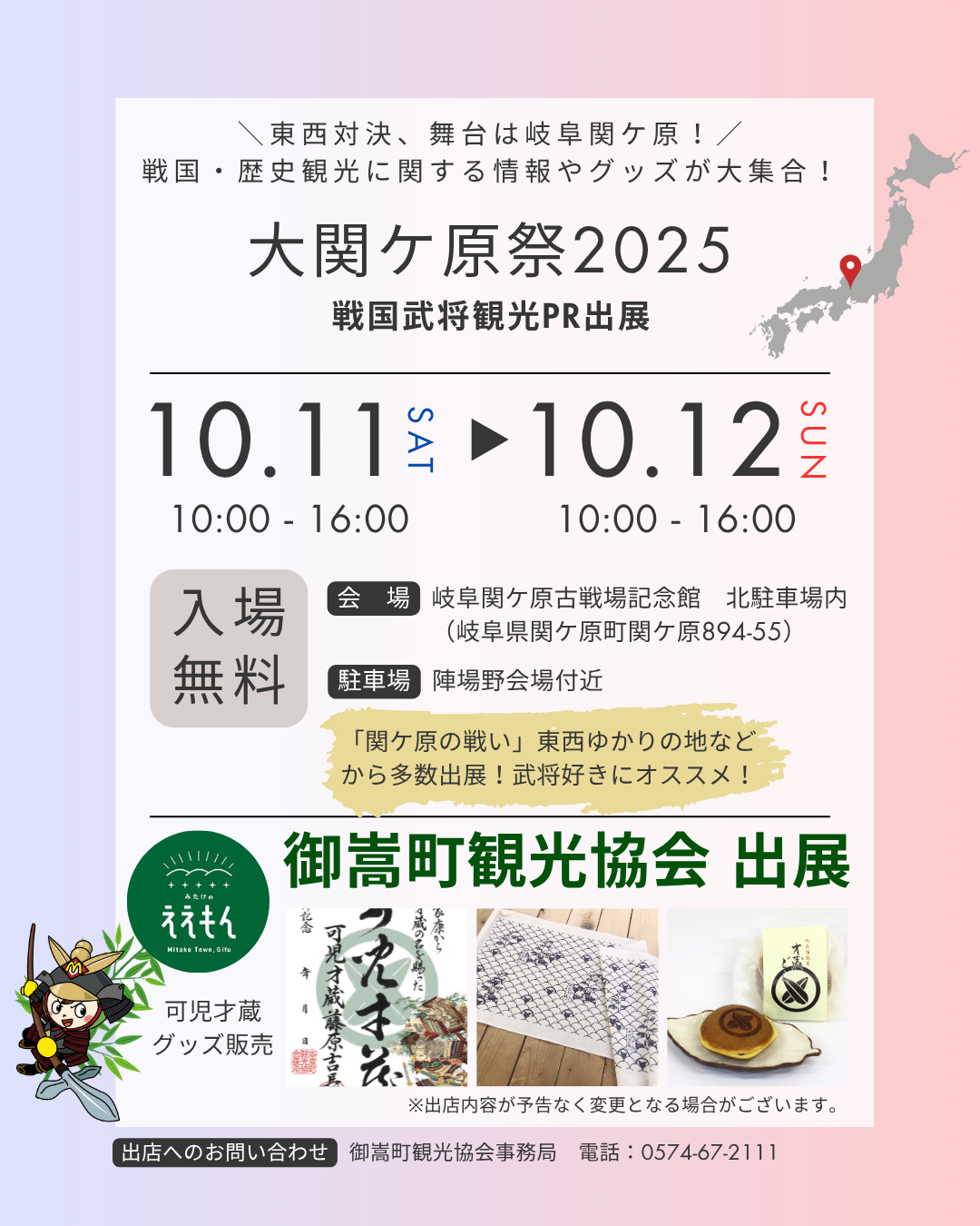 戦国武将観光PRブースに御嵩町観光協会も出展します。 ▶イベント詳細名称|大関ケ原祭2025日時|令和7年10月11日(土)/10月…