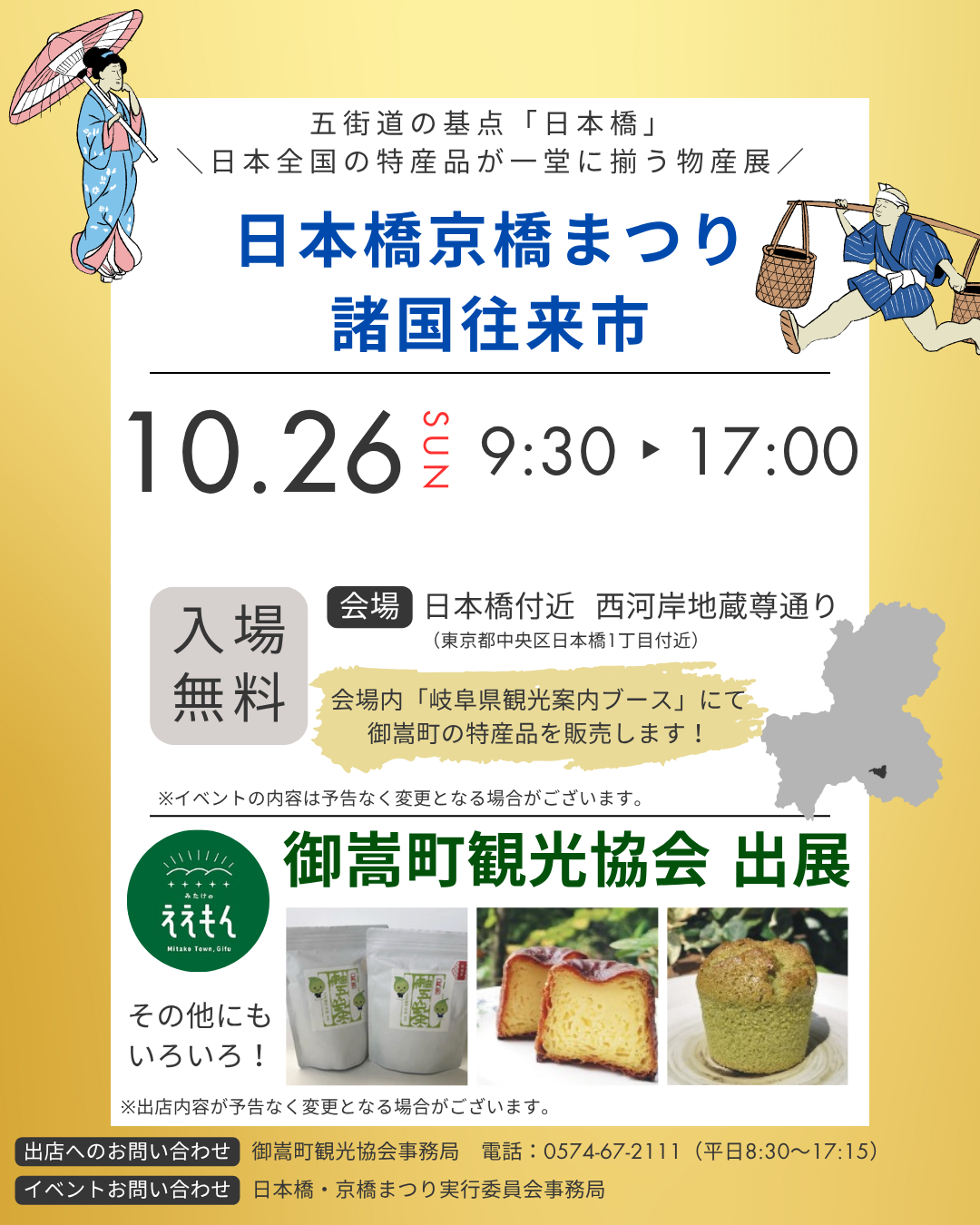 雨天のため、イベント開催は中止されました。 御嵩町観光協会も出店します。 日本橋・京橋まつりとは?江戸から全国へつながる五街道…