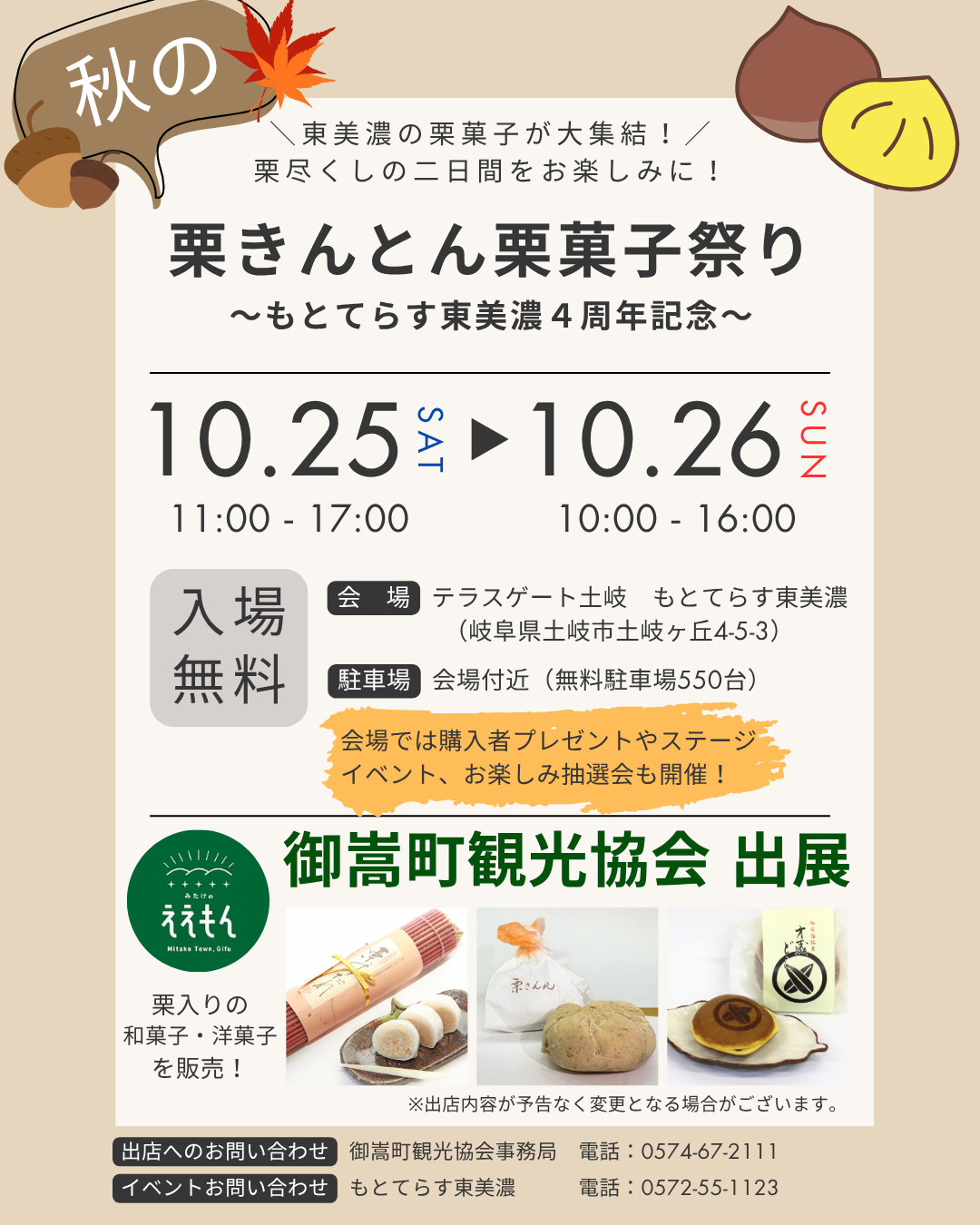 御嵩町観光協会も出店します。 栗きんとん・栗菓子好きの皆さん、必見!もとてらす東美濃4周年記念として「栗きんとん・栗菓子祭り」が開催…